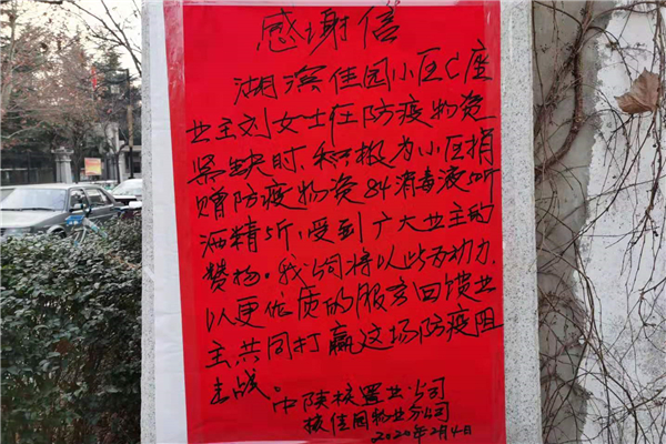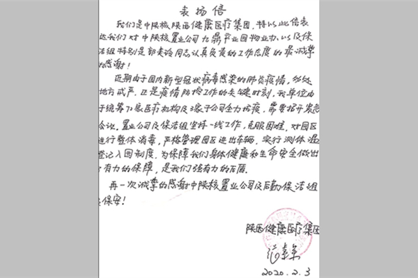 陕西健康医疗集团送来感谢信,对置业公司九鼎产业园物业办以及保洁组特别是郭美玲同志认真负责的工作态度表达了最诚挚的感谢,称赞置业公司为他们开展工作提供了坚强有力的物业保障。陕西健康医疗集团由于统筹 72 家医疗机构及 3 家子公司全力抗疫,需要召开紧急会议,置业公司保洁组坚持一线工作,克服重重困难,对园区上下进行整体消毒,严格管控园区进出车辆、人员,确保了会议的顺利召开。