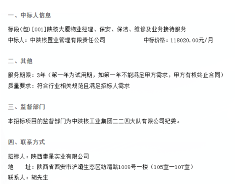 近日,据龙标招投标交易平台消息,由陕西秦星实业有限公司招标的陕核大厦物业服务项目中标结果显示,中陕核置业管理有限责任公司在激烈竞标中勇夺头筹,成功中标该项目。